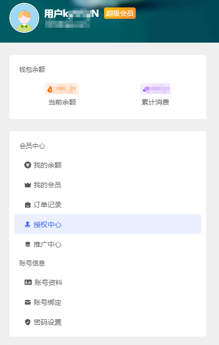 在授权站点击右上角头像进入【个人中心】→【授权中心】