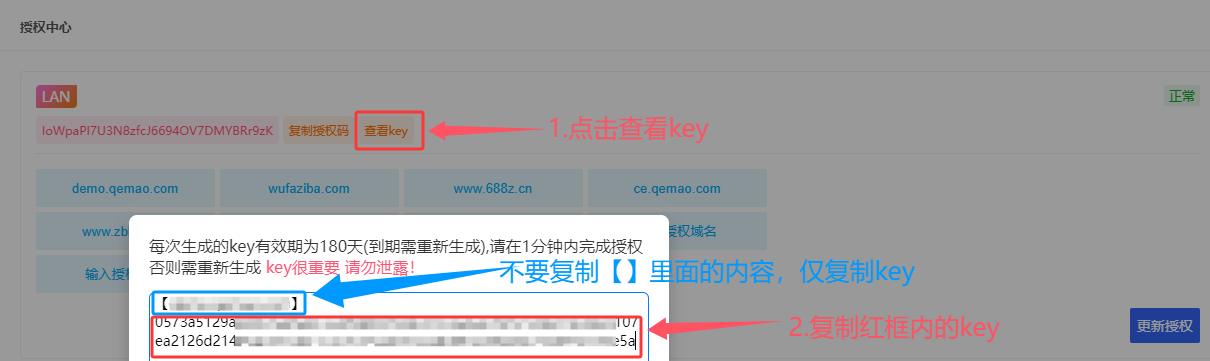 更新授权域名后 点击上方【查看key】,然后复制对应域名的key,去你自己搭建的网站